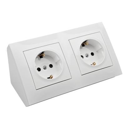 Hjørne, utenpåliggende boks 2-hull enkelt uttak med Schuko jording, 16A, hvit