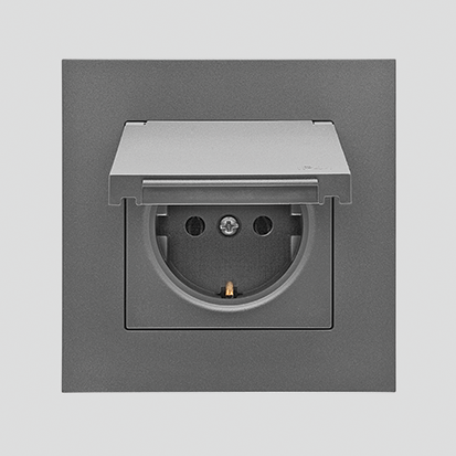 IP44 enkel Schuko stikkontakt med lokk og rammeforsegling - samme farge klaff og ramme, grå matt, 16A