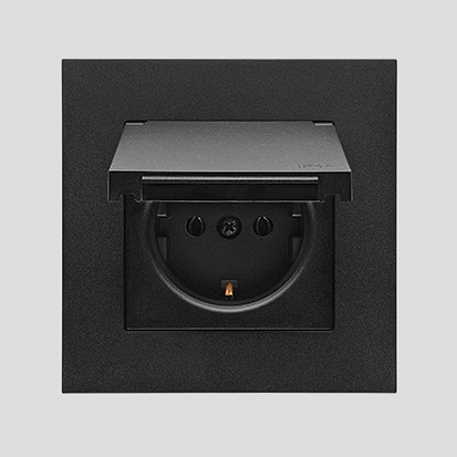 IP44 enkel Schuko stikkontakt med lokk og rammeforsegling - samme farge klaff og ramme, svart matt, 16A